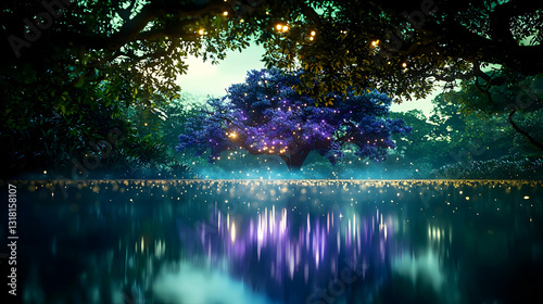 enchanted forest, mystic, water reflection, night, dark, tree, forest, lake, water, nature, digital artwork, illustration, blue, green, purple, light, sparkle, glow, atmosphere, serene, peaceful, calm, tranquil, quiet, stillness, beauty, wonder, magic, dreamlike, aethereal, surreal, whimsical, fantasy art, background, wallpaper, art, beautiful, colourful, vibrant