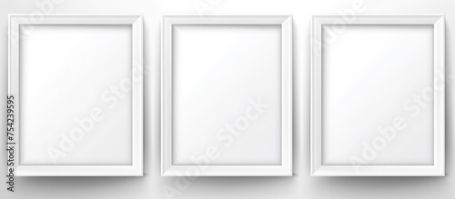 A plain white wall with three matching white frames hanging on it. The frames are arranged in a neat and orderly manner, creating a minimalist and modern look.