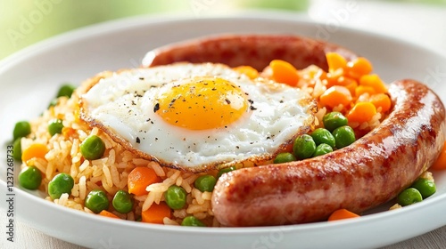 A plate of American fried rice with a perfectly fried egg, sausages, peas, and carrots, served on a bright white plate against a soft background
