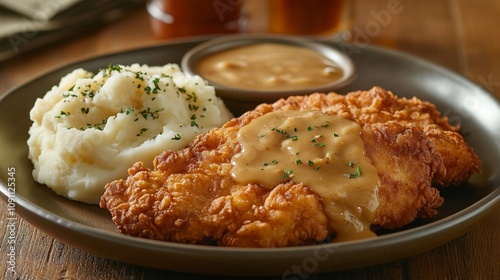 A plate of crispy Fried Chicken with golden-brown skin, served with a side of mashed potatoes and gravy. on a wooden table.