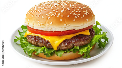 A Plate of Juicy Beef Cheese Burger with Lettuce and Tomato, Isolated on White Background