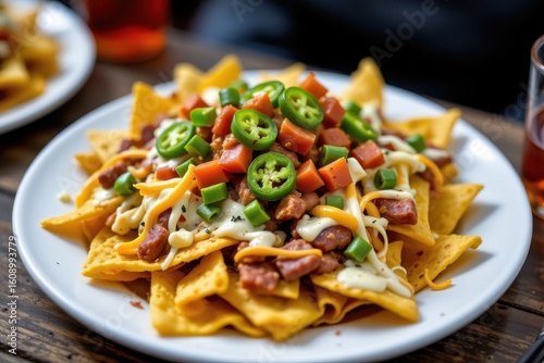 plate, nacho, covered, cheese, cured, meat, visible, sodium, rich, bright, food, display, ai, generative