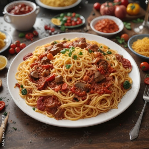 wooden chair, sideboard, food, dining table, centrepiece, spaghetti
