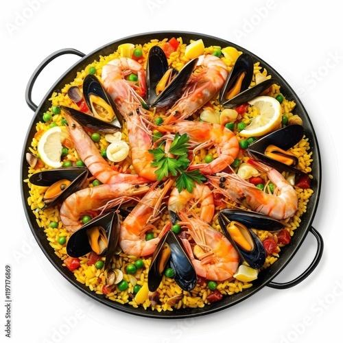 A platter of fresh seafood paella with shrimp and mussels, isolated white background, modern art style