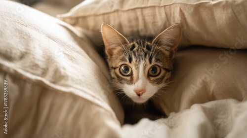 A playful cat hiding among the beige pillows, its tail peeking out. Soft, natural light. Clear focus on the cat, wide-angle background.
