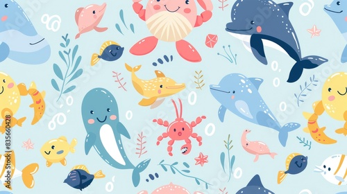 A playful pastel pattern of cartoon sea creatures such as crabs, dolphins, and fish, all with happy expressions and summer elements