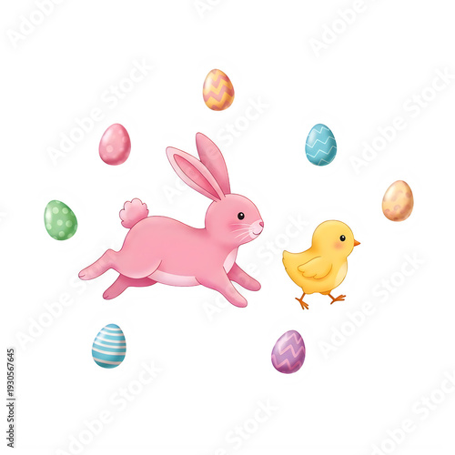 A playful scene of a pink bunny and a yellow duck surrounded by floating colorful balls isolated on transparent background