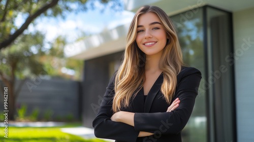 A poised American real estate agent stands outside a sleek, modern home, her confident posture and friendly expression inviting potential buyers to explore the property, radiating