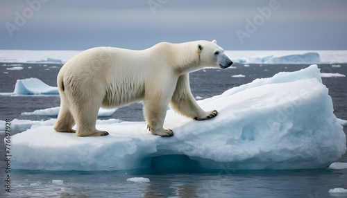 A polar bear stranded on a small iceberg, surrounded by melting ice and open water, Global warming and climate change concept