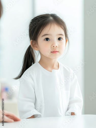 asian, girl, children, children, portrait, young, cute, adorable, beautiful, innocent, happy, smile, cheerful, playful, white, shirt, ponytail, hair, eye, brown eyes, looking, listening, attentive, curious, anticipation, thoughtful, sweet, charming, childhood, innocence, expression, photo, royalty free, image, high-quality, professional, vibrant, light, background, bright, indoor, studio, family, love, care