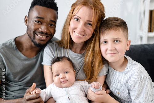A portrait of happy multiracial family at home. A multiethnic spouses, their cute newborn baby girl and school-age son look into the camera and smile.