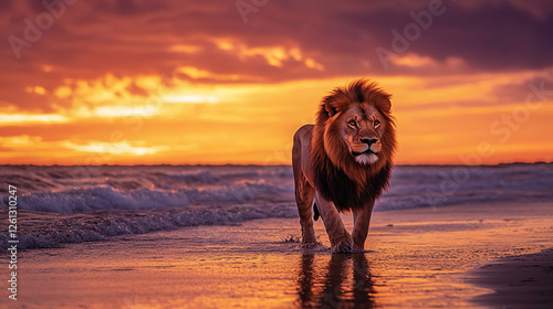 A powerful lion walking along the shore at sunset, with its reflection in the water, symbolizing strength, courage, and the wild beauty of nature.