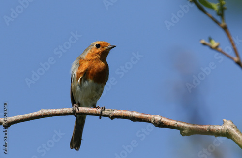 A pretty Robin, redbreast, Erithacus rubecula, perching on a branch of a tree in Spring.