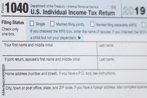 A printed IRS 1040 tax year 2019 form is shown in 2020 in a closeup view. The Internal Revenue Service tax filing deadline has been extended from April 15 to July 15 this year.