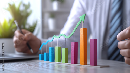 A professional analyzing a colorful bar chart illustrating growth in a modern office setting.
