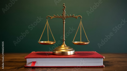 A professional legal symbol photograph featuring brass balance scales of justice positioned on top of a thick red hardcover book