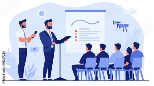 A professional presentation scene with a speaker addressing an audience, accompanied by a visual aid on a screen, emphasizing communication and engagement.
