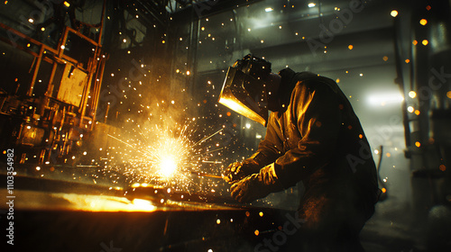 A professional welder in a workshop, wearing a protective helmet and gloves