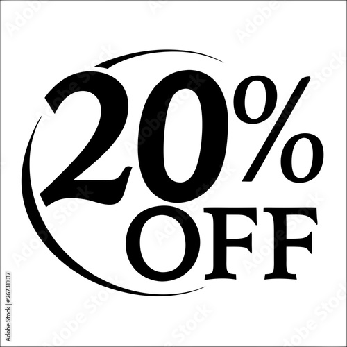 a promotional graphic with the text "20% OFF" in bold, black letters on a white background. The number "20" is large and prominent, with a curved line partially encircling it