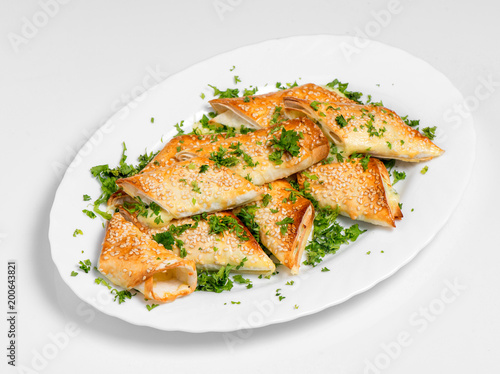 A puff pastry pie with cheese coated with sesame seeds