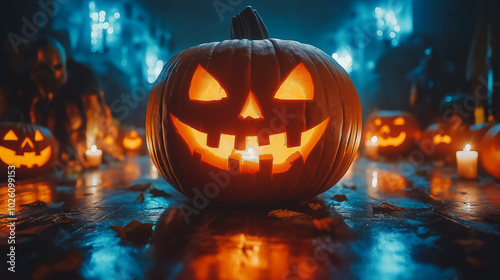 A pumpkin with a smiley face on it is surrounded by other pumpkins. The scene is set in a dark room with candles and a blue background