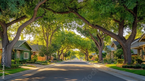 A quiet, eco-conscious residential area with green homes, large trees arching over the streets, and well-maintained, eco-friendly gardens creating a peaceful vibe.