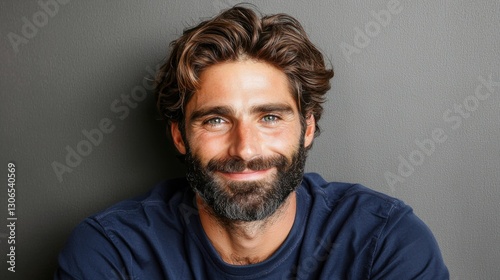 A radiant and ultra-detailed studio image of a man in a navy blue shirt, captured in a moment of laughter, his expression full of life and confidence against a neutral grey backdrop