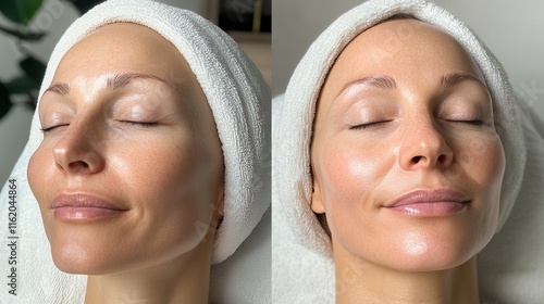 a radiant client’s face after a biorevitalization session, showing smooth, plump, and hydrated skin, with a soft, natural glow.
