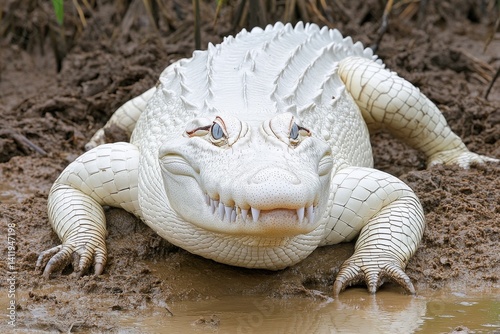 A rare albino alligator resting on the muddy banks of a swamp