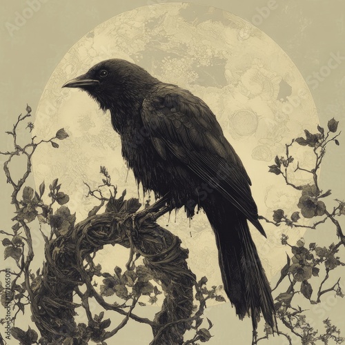 raven, moon, nature, tree branch, silhouette, dark, mystical, artwork, animal, bird, foliage, vintage, monochrome, shadow, eerie, night, fantasy, illustration, graphic, decor, symbolism, chaplet, flora, contrast, serene, mysterious, detailed, artistic, composition, branch, gothic, atmospheric, wildlife, landscape, beauty, elegance, enchanting, haunting, scene, tranquil, poetic, art, design, creative, visual, inspiration, texture, depth