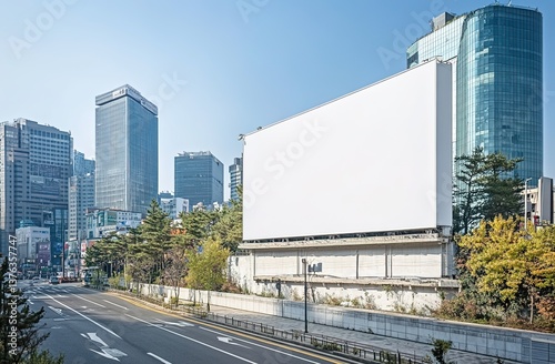 city, scene, blank, billboard, modern, urban, street, tall, building, green, tree, pedestrian, vehicle, clear, blue, sky, bright, sunlight, realistic, style, commerce, atmosphere, metropolitan, architecture, downtown, vibrant, tied-up, city landscape, landscape, advertising, space, commercial, dynamic, lively, energetic, contemporary, urbanism, daylight, bustling, active, environment