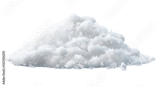 A realistic pile of soft, fluffy white snow, cut out and isolated on a transparent background, with fine details of snowflakes visible on the surface.