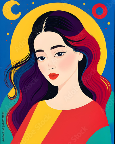 artificial, generative, cute, feminine, female, colourful, expressive, black hair, red, asian, brunette, vibrant, rainbow, woman, face, hair, vector, illustration, beauty, fashion, art, head, lip, lady, cartoon, person, glamour, eye, coiffure, style, drawing, model, design, eye, people, make-up, black, oval, serious, charming, charme, reddening, blue, detailed, simple