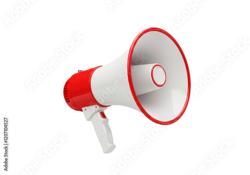 A red and white megaphone with a sleek modern design, isolated on a white background