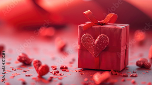 A red box with a heart on it sits on a red background. The box is surrounded by a pile of red confetti, giving the impression of a celebration