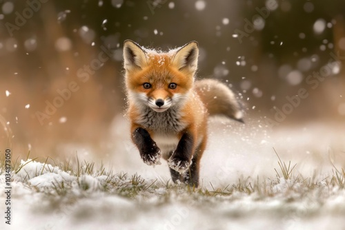 fox, red, kit, baby animal, running, snow, winter, forest, nature, wildlife, animal, mammal, canino, cute, adorable, fluffy, playful, snowflake, grass, ground, white, brown, orange, yellow, green, blur, depth, of, field, shallow, outdoors, day, light, bright, photo, photograph, image, picture, photo, art, animal, fauna, vertebrate