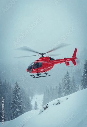 helicopter, winter storm, terrain, red, vibrant, flake, sky, resilience, expertise, rotor, snowfall, navigation, landscape, tree, hill, dramatic, atmosphere, urgency, determination, skill, bravery, operation, challenging, environment, weather, aviation, emergency, rescue, flight, nature, visibility, winter, cold, adventure, scene, altitude, dynamic, transport, icy, snow, flurry, condition, exploration, aerial, aircraft, chopper