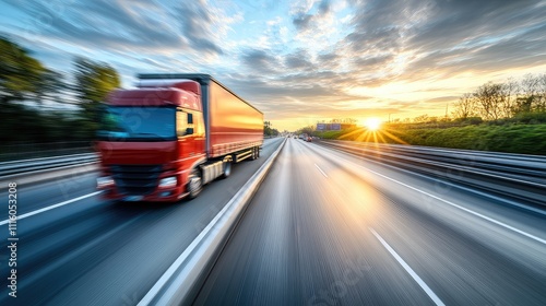 A red semi-truck drives swiftly on a highway as the sun sets, highlighting the vehicle's bright color and reflections in warm tones