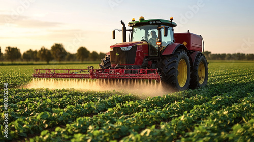 tractor, farming, agriculture, spraying, crop, field, sunset, golden hour, rural, farm, machinery, sprayed, field work, green, red, sun, light, mist, soft, aethereal, large