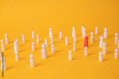 A red wooden figurine of a person is in a crowd of figurines on a yellow background
