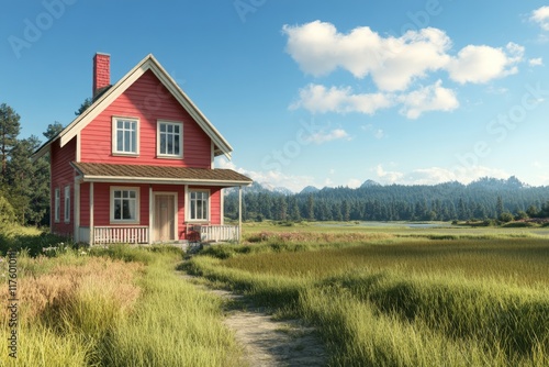 house, home, bungalow, red, wooden, field, grass, green, hill, tree, nature, landscape, rural, countryside, outdoors, scenic, beautiful, peaceful, tranquil, serenity, calm, picturesque, idylli, farm, real estate, cloud, living, property, environment, meadow, sunlight, minimalist, perspective, agriculture, design, get-away, vacation, sky, architecture, aspiration, travel, lifestyle, construction, dream, simple, horizon, building, escape