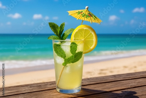 A refreshing citrus-infused beverage awaits on a sunlit beach, with the vast ocean and clear blue sky as its backdrop