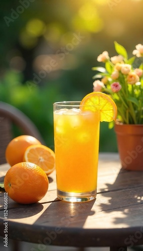 A refreshing glass of orange juice sits on a sun-drenched patio table amongst summer blooms, capturing the essence of a warm, sunny day , drink, fruit