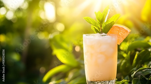 A refreshing grapefruit and mint cooler, garnished with mint leaves, in a sunny outdoor setting
