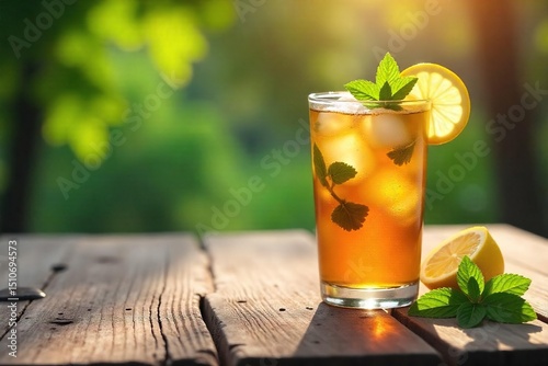 A refreshing iced tea, lemon slices, and mint sprigs on a rustic wooden table, bathed in soft sunlight, suggesting tranquility and peaceful relaxation , herbal, aromatic
