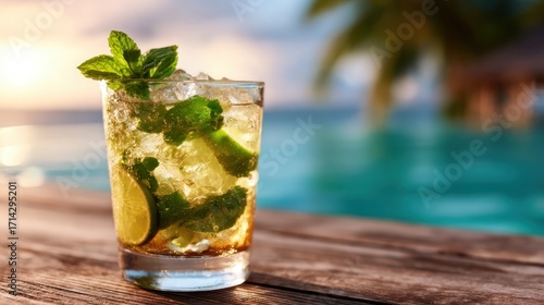 A refreshing mojito cocktail garnished with mint and lime, sparkling in a glass, set against a serene poolside backdrop during a beautiful sunset.