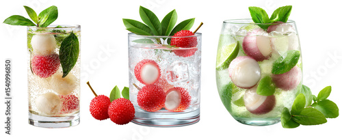 A refreshing set of three Lychee Fizz mocktails featuring whole lychee fruit, fresh mint leaves, and sparkling water in transparent glasses. Isolated on transparent background.
