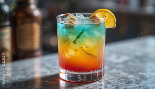 A refreshing summer drink with lemon slices, mint leaves, and ice cubes in a tall glass on a busy bar or kitchen counter. 4K HD image.
