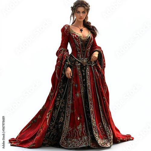 A regal woman in a flowing red and gold medieval gown stands against a white background.