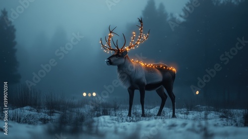 animal, cervid, light, antler, winter, snow, forest, nature, illuminated, christmas, festive, magic, fantasy, glow, dusk, evening, fog, misty, cold, branch, reindeer, creature, wildlife, mammal, landscape, scenery, peaceful, serene, calm, tranquil, aethereal, season, holiday, decoration, beautiful, stunning, elegant, dark, bokeh, warmth, soft, bright, subtile, sparkle, grain, gentle, magical